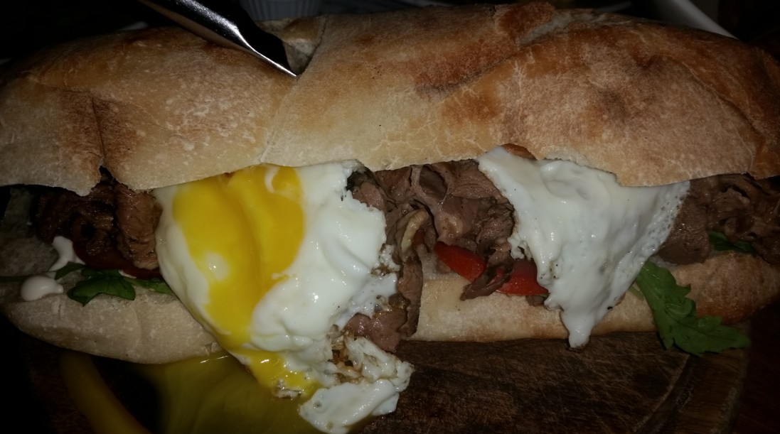 כריך שחיבבתי במיוחד: כריך סטייק & EGG – פרוסות סינטה עם חרדל דיז'ון, מיונז, בצל סגול,עגבניה, עלי רוקט, ביצת עין ובצל מטוגן.