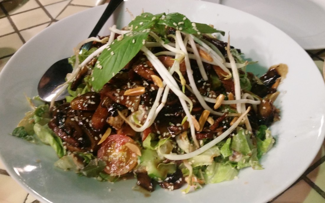 סלט אווז מוקפץ בטריאקי עם פטריות, חסות, נבטים ועוד ברוטב ויניגרייט שומשום. סלט מעולה, עשיר במרקמים וטעמים.
