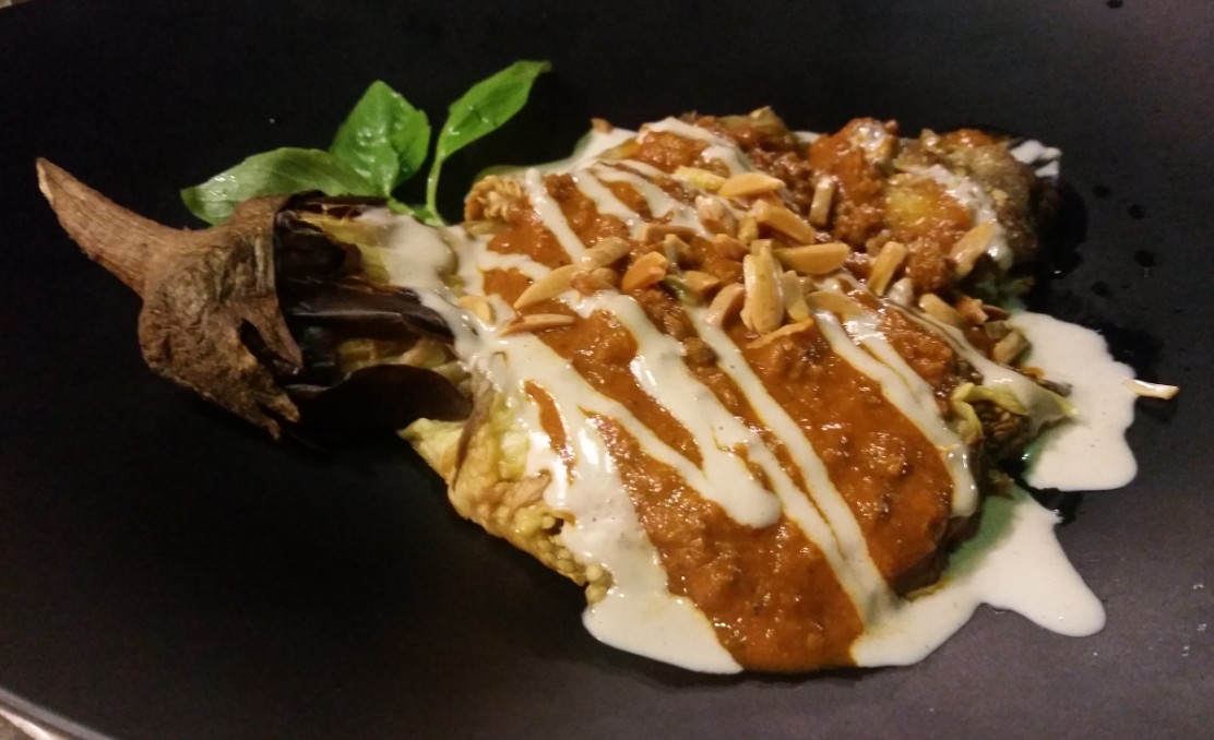 חציל בלאדי עם עגל קצוץ ברוטב עגבניות וטחינה גולמית. מנה מעולה ומיוחדת. לא עוד "חציל בטחינה" סטנדרטי.