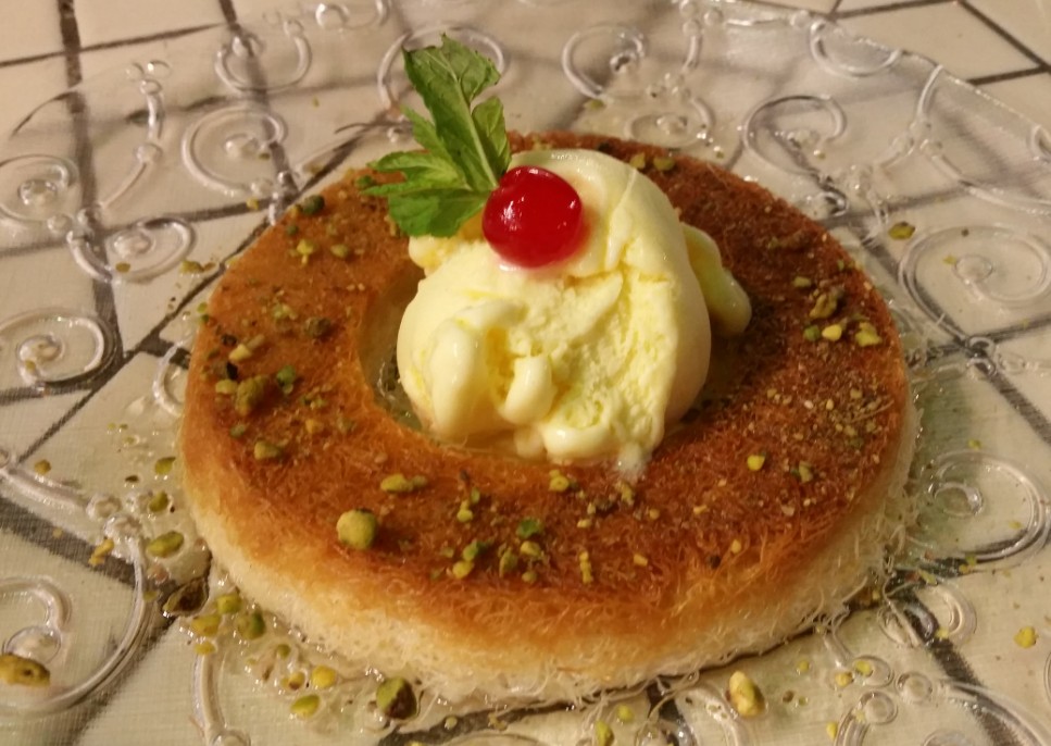 ובגזרת האתני, קיבלנו כנאפה "עם טוויסט" – הכנאפה היא כנאפה לכל דבר ועניין (במילוי גבינת עזים, עם הרוטב המסורתי), אבל קצת יותר מסוגננת ובתוספת כדור גלידת וניל באמצע. למרות שכבר לא היה מקום, התענגנו על כל ביס.