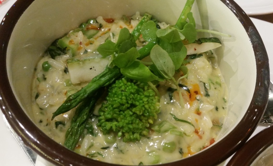 ריזוטו ירוקים מצוין שמכיל אספרגוס, שעועית ירוקה ומגוון ירוקים נוספים, עם חמאה ופרמז'ן, כמובן. ספלדיני פונגי – הכולל מגוון פטריות, עם שמן כמהין וקרם פטריות – תענוג אמיתי! וחונקי כמרים עם שמן זית, שום, עגבניות שרי, ארטישוק, פסטו, זיתי קלמטה ועוד – מנה עשירה וטעימה מאוד.
