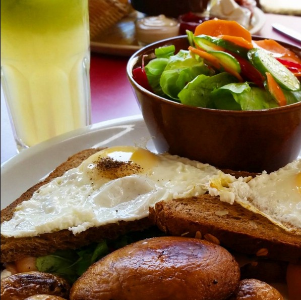 אני הזמנתי ארוחת בוקר צרפתית, שכללה טוסט עם שמנת וסלמון, לצד תפו"א אפויים ופטריות, סלט טרי ומיץ תפוחים טבעי.