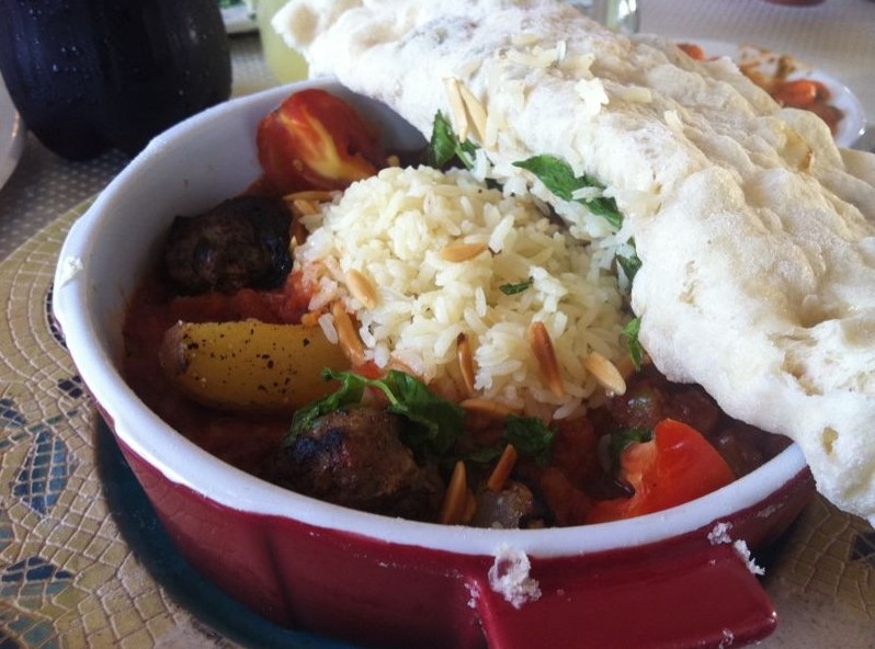 - הרכבה: שמים את האורז המבושל בצורה של כיפה במרכז קערה גדולה שאפשר להכניס לתנור. מניחים את קציצות הקבב מסביב לאורז. מזלפים מעל רוטב עגבניות.